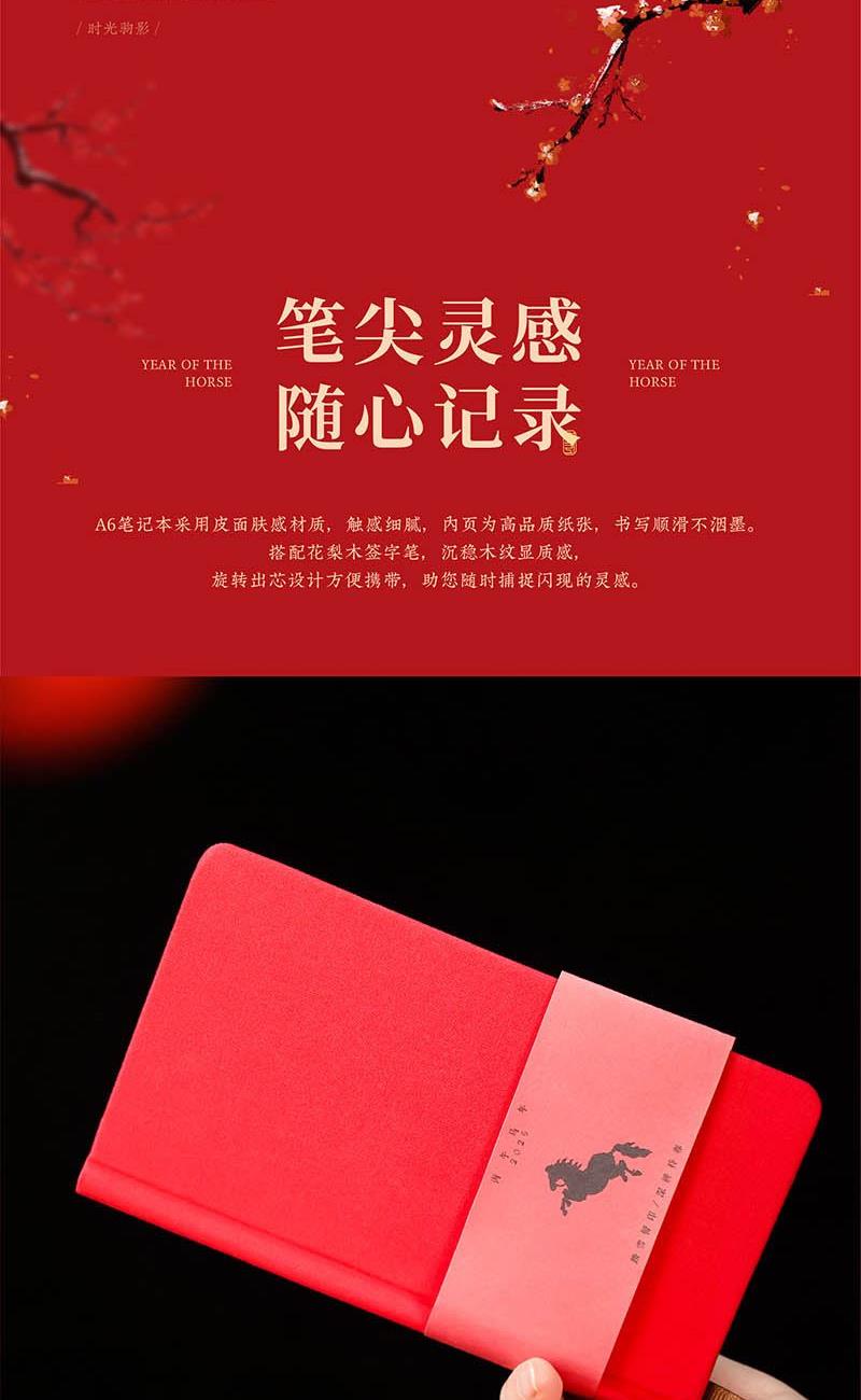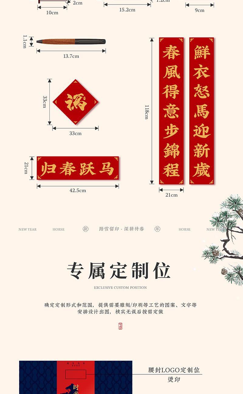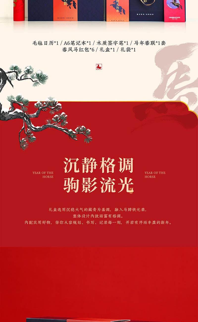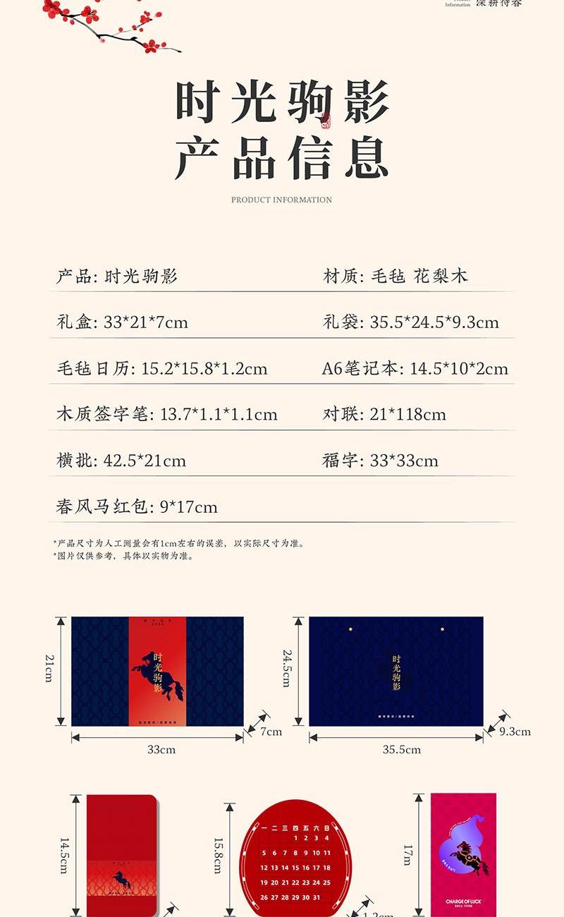 礼盒清单 毛毡日历*1 A6笔记本*1 木质签字笔*1 马年春联*1套 春风马红包*6 礼盒*1 礼袋*1 产品信息 产品 / Product Mini 时光驹影 材质 / Material 毛毡 花梨木 规格 / Size 礼盒:33*21*7cm 礼袋: 毛毡日历:15.2*15.8*1.2cm A6笔记本:14.5*10*2cm 木质签字笔:13.7*1.1*1.1cm 对联:21*118cm 横批:42.5*21cm 福字:33*33cm 春风马红包:9*17cm