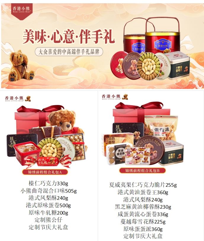 香港小熊,主打健康,美味,用心,产品覆盖了小熊曲奇,蛋卷王,凤梨酥,脆片,雪花酥,牛轧糖等40-50款。产品大多选用进口黄油,可可,抹茶粉等优质原材料,打造0添加健康食品,口感细腻浓郁,层次丰富回味无穷。包装方面,涵盖了铁盒,精致透明盒,节庆特色礼盒等多系列。