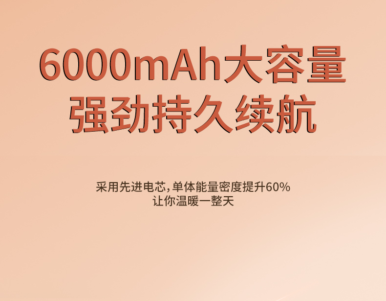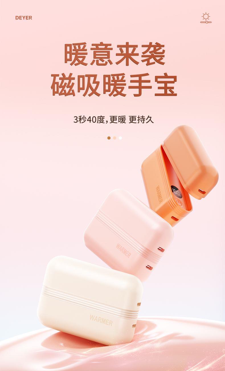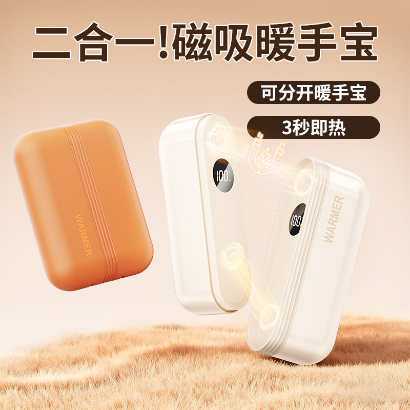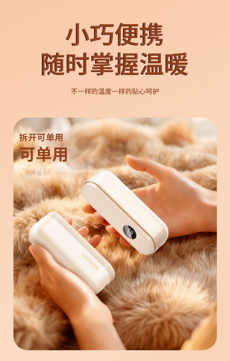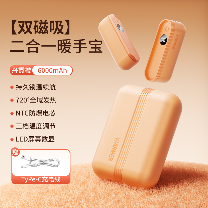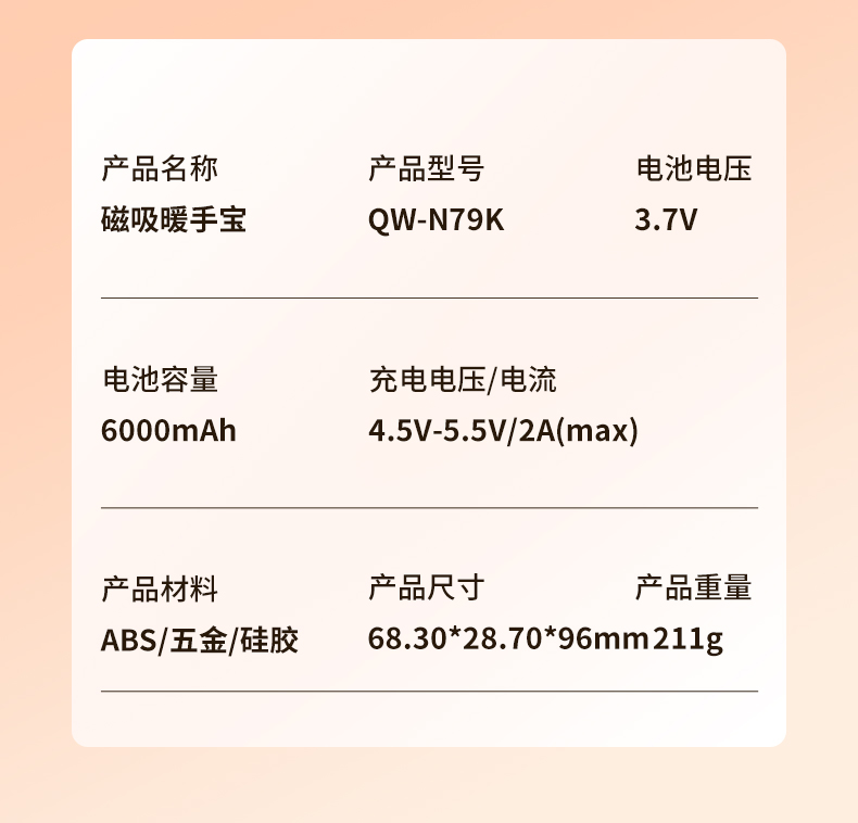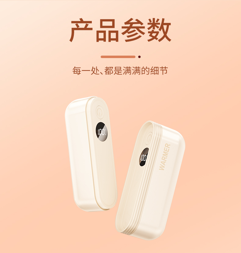 【颜色】杏色、橙色、粉色 【产品规格】68.3*28.7*96mm 【包装尺寸】125*38*117mm 【产品净重】211g/281g 【电池容量】3000mAh*2 【暖手温度】1档40°,2档50°,3档60° 【暖手时间】2.5-7小时 【输入】5V 【产品材质】ABS+PC+铝合金 二合一磁吸设计,随身携带方便,亲肤软硅胶手感 三秒速热, 三档温控,快速升温,智能温控,安全防爆,舒适手感 快速充电,智能芯片,720°全域发热
