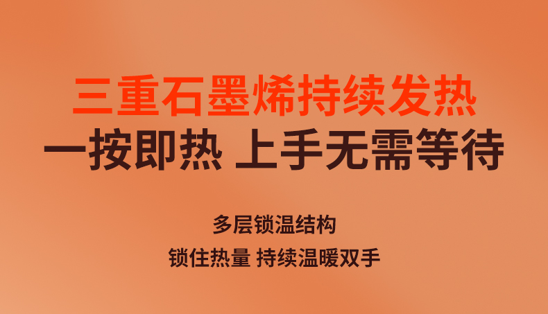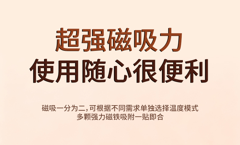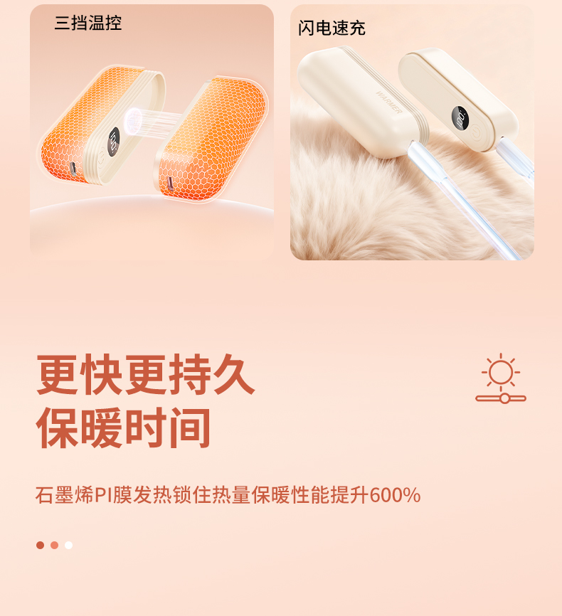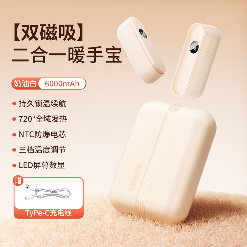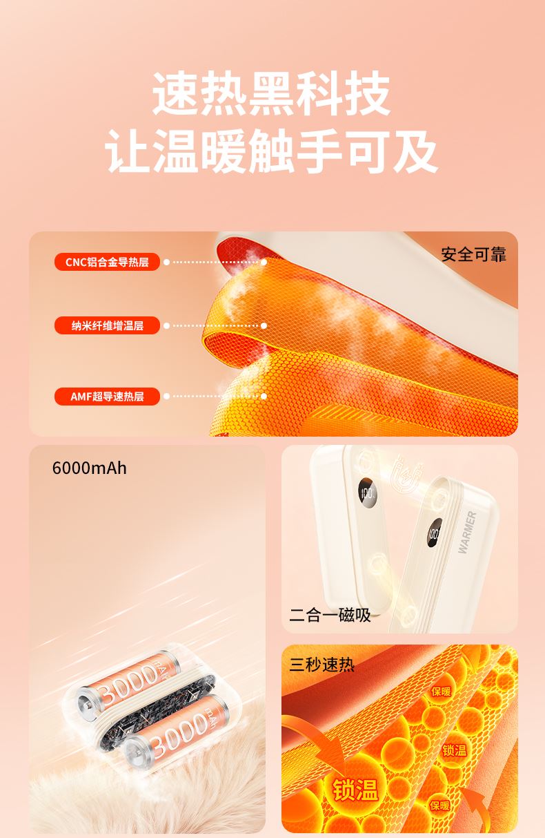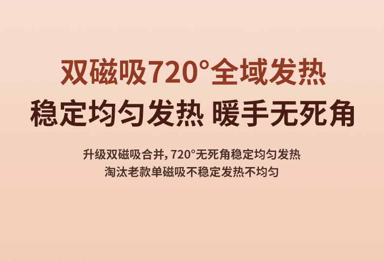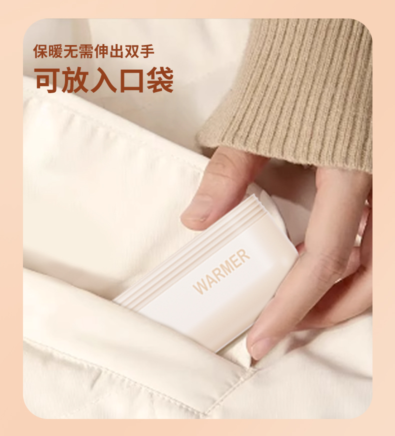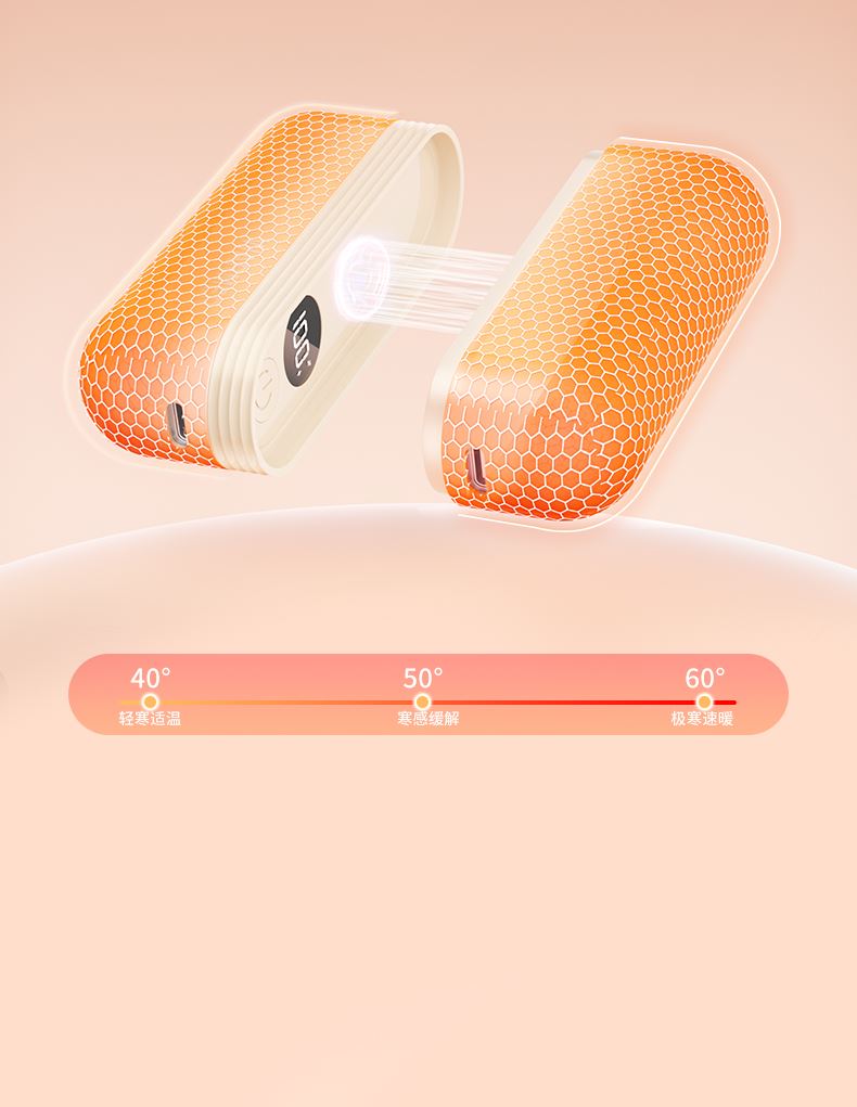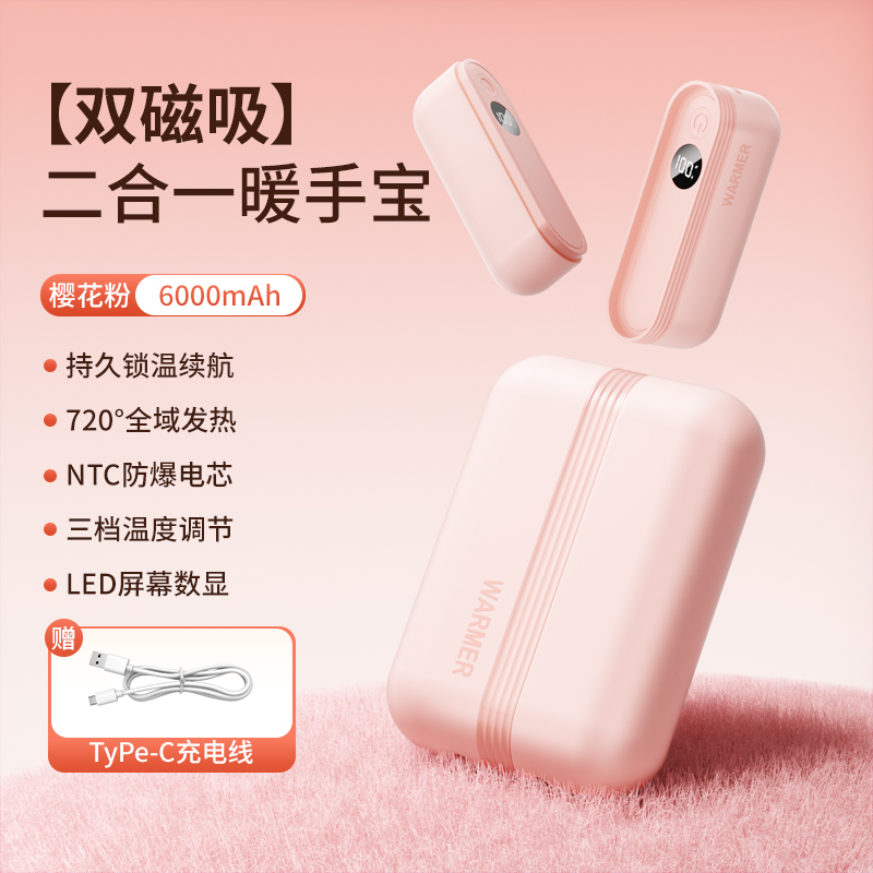 【颜色】杏色、橙色、粉色 【产品规格】68.3*28.7*96mm 【包装尺寸】125*38*117mm 【产品净重】211g/281g 【电池容量】3000mAh*2 【暖手温度】1档40°,2档50°,3档60° 【暖手时间】2.5-7小时 【输入】5V 【产品材质】ABS+PC+铝合金 二合一磁吸设计,随身携带方便,亲肤软硅胶手感 三秒速热, 三档温控,快速升温,智能温控,安全防爆,舒适手感 快速充电,智能芯片,720°全域发热